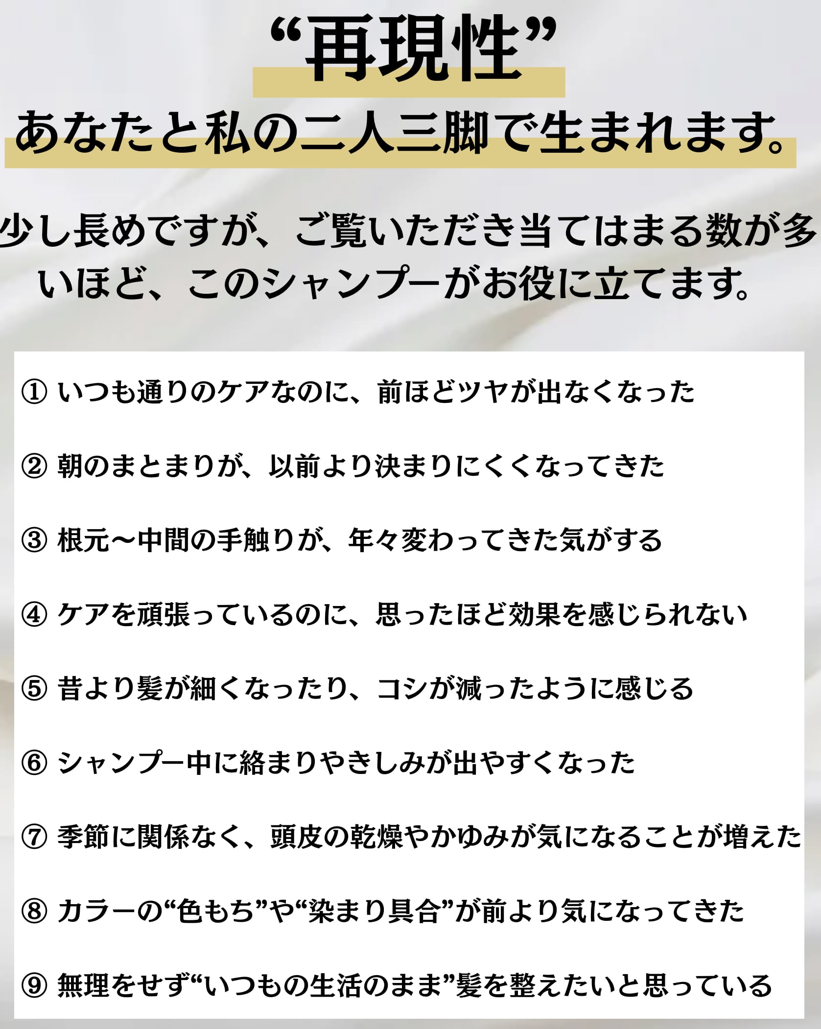 毎日のシャンプーで無理なく整えることを目的としています。